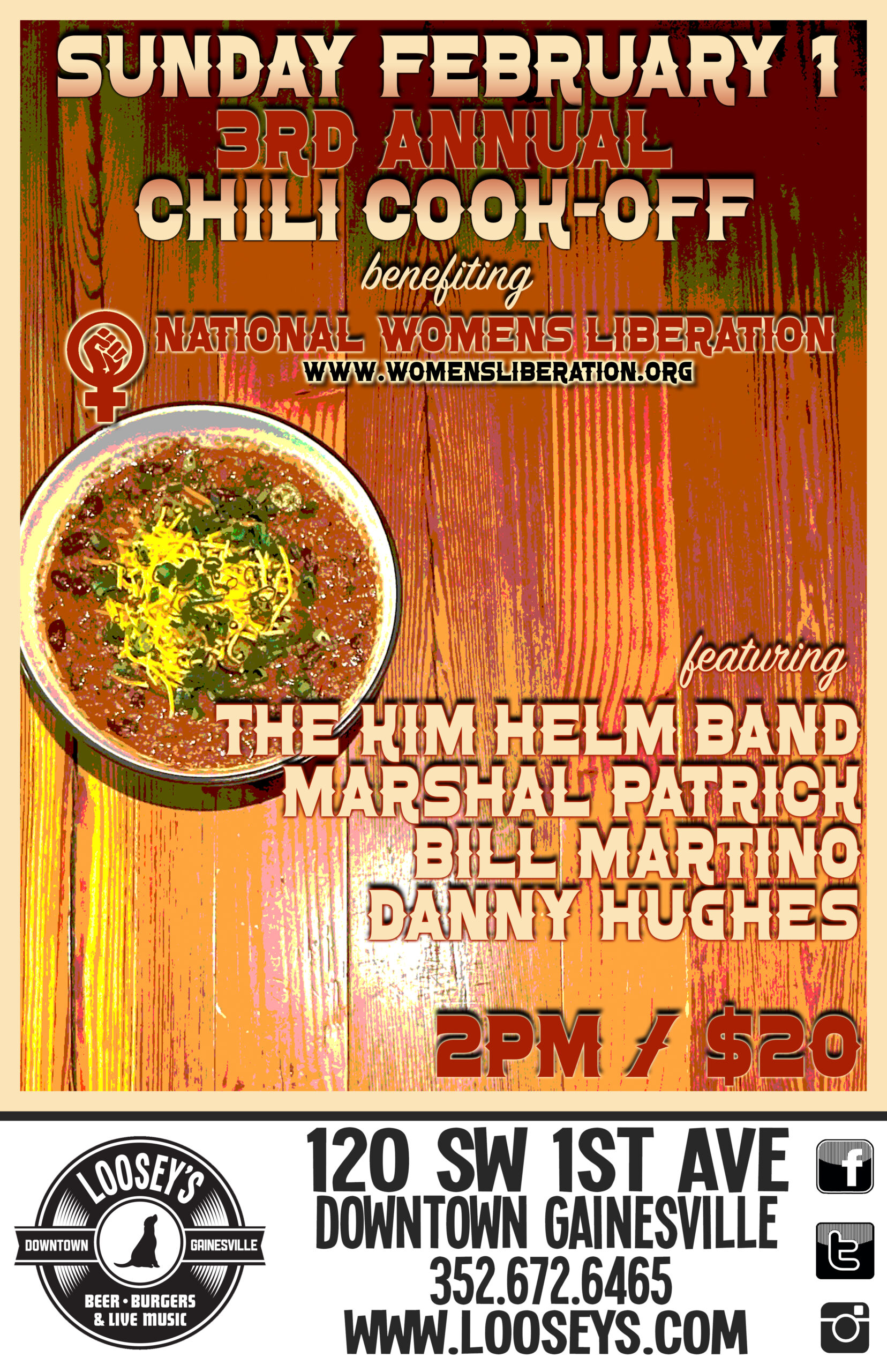 Sunday February 1st at 2pm: It’s the now (locally) famous (at least) Loosey’s Chili Cook-Off benefitting National Women’s Liberation!
